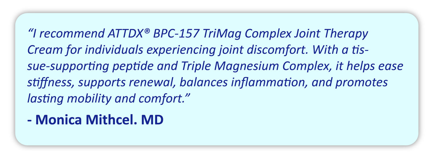 ATTDX® BPC-157 TriMag Complex Joint Therapy Cream is designed with targeted transdermal delivery, combining a clinically studied tissue-supporting peptide with magnesium, an essential cofactor for inflammatory balance and muscle function.