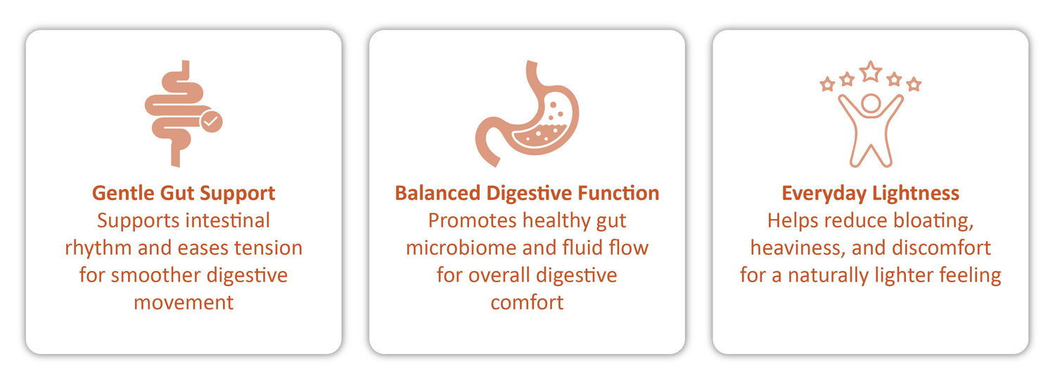 By rebalancing the body’s fluid flow and microbiome environment, it helps reduce bloating, heaviness, and that stuck feeling, leaving you lighter, more comfortable, and naturally in sync every day.